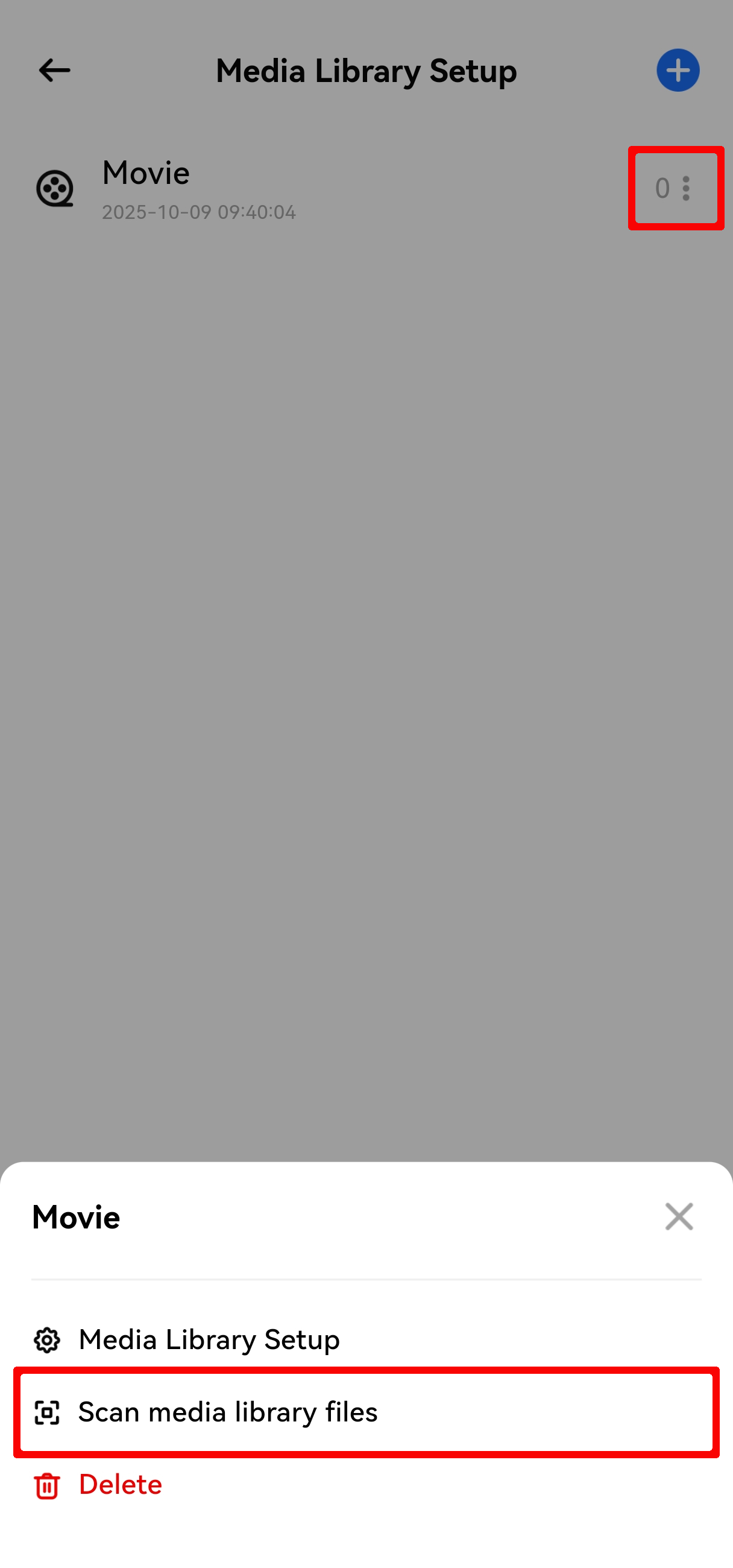 - 点击扫描媒体库文件,系统将自动开始扫描该媒体库下的所有文件,同步新增、删除、修改的影视资源,并重新校验/补全影视元数据。