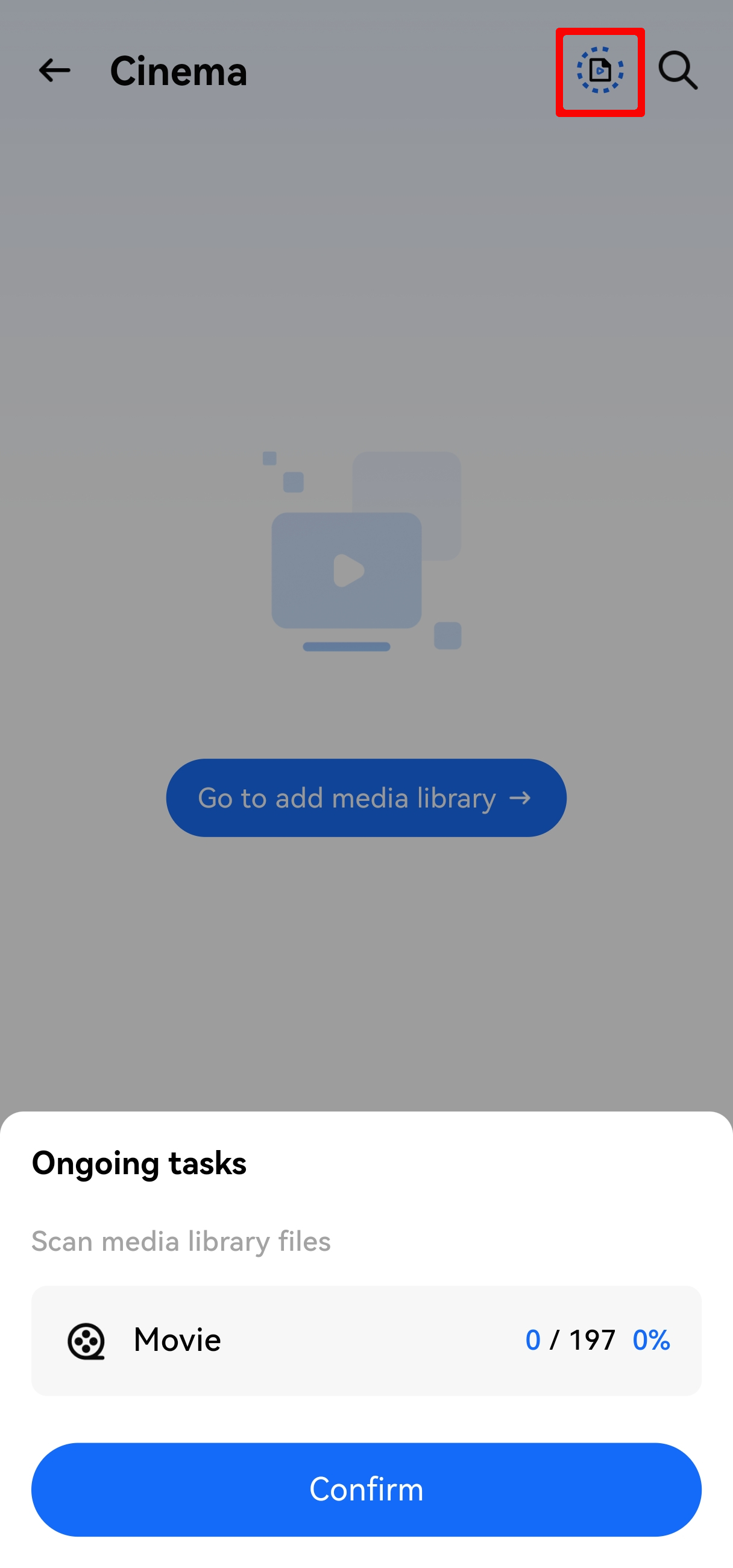 - 刷新耗时与影视资源规模相关:扫描过程将在后台持续进行,耗时与视频资源规模相关(视频越多,耗时越长)。若需查看进度,可通过 影院首页 > 顶部菜单 点击查看处理状态。