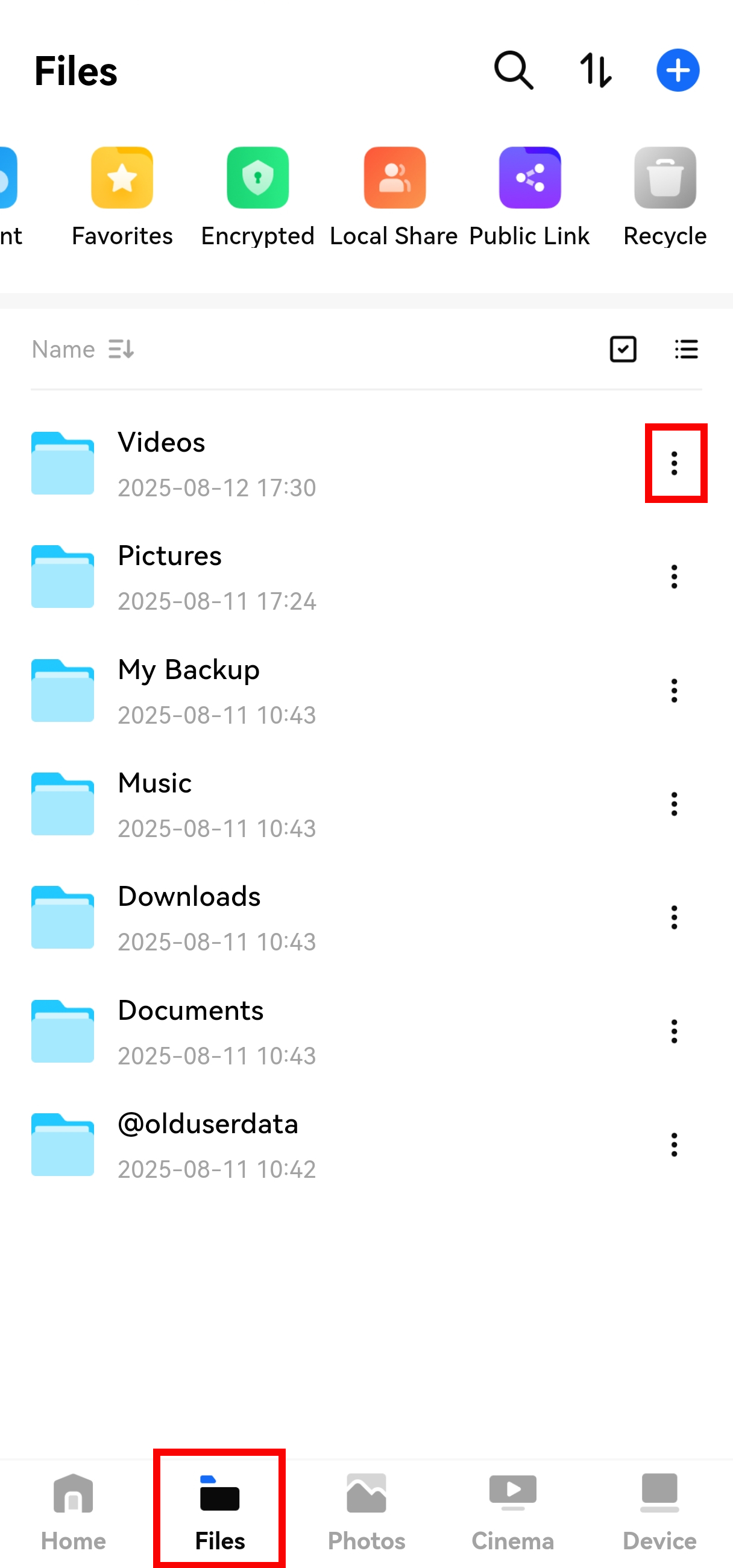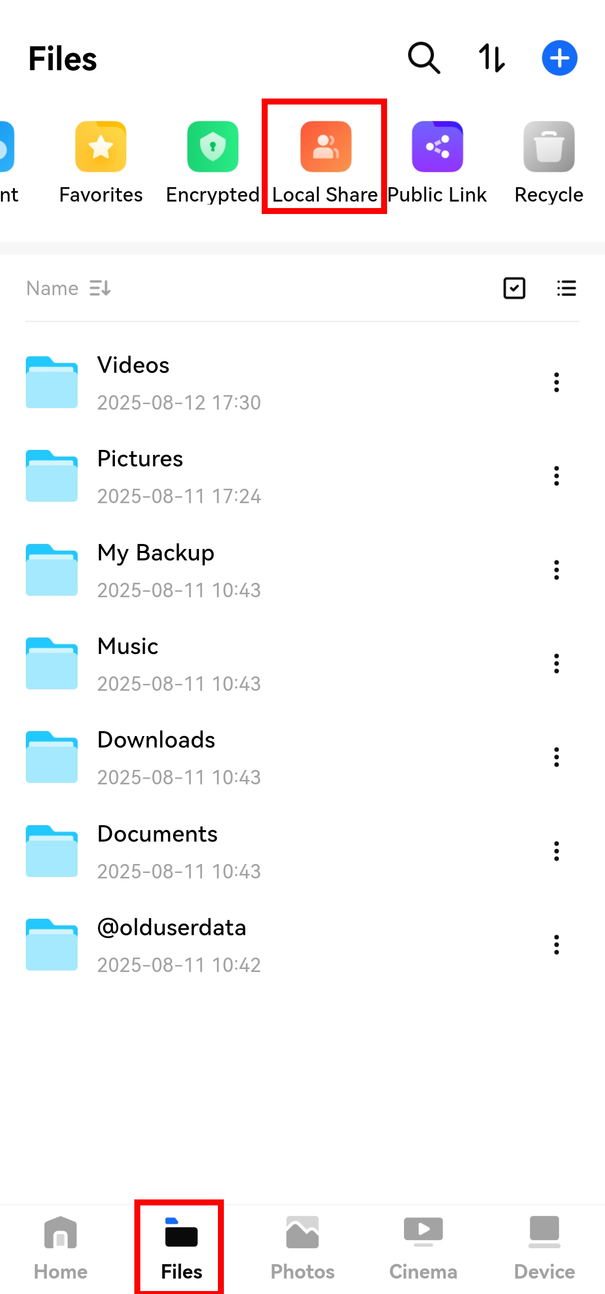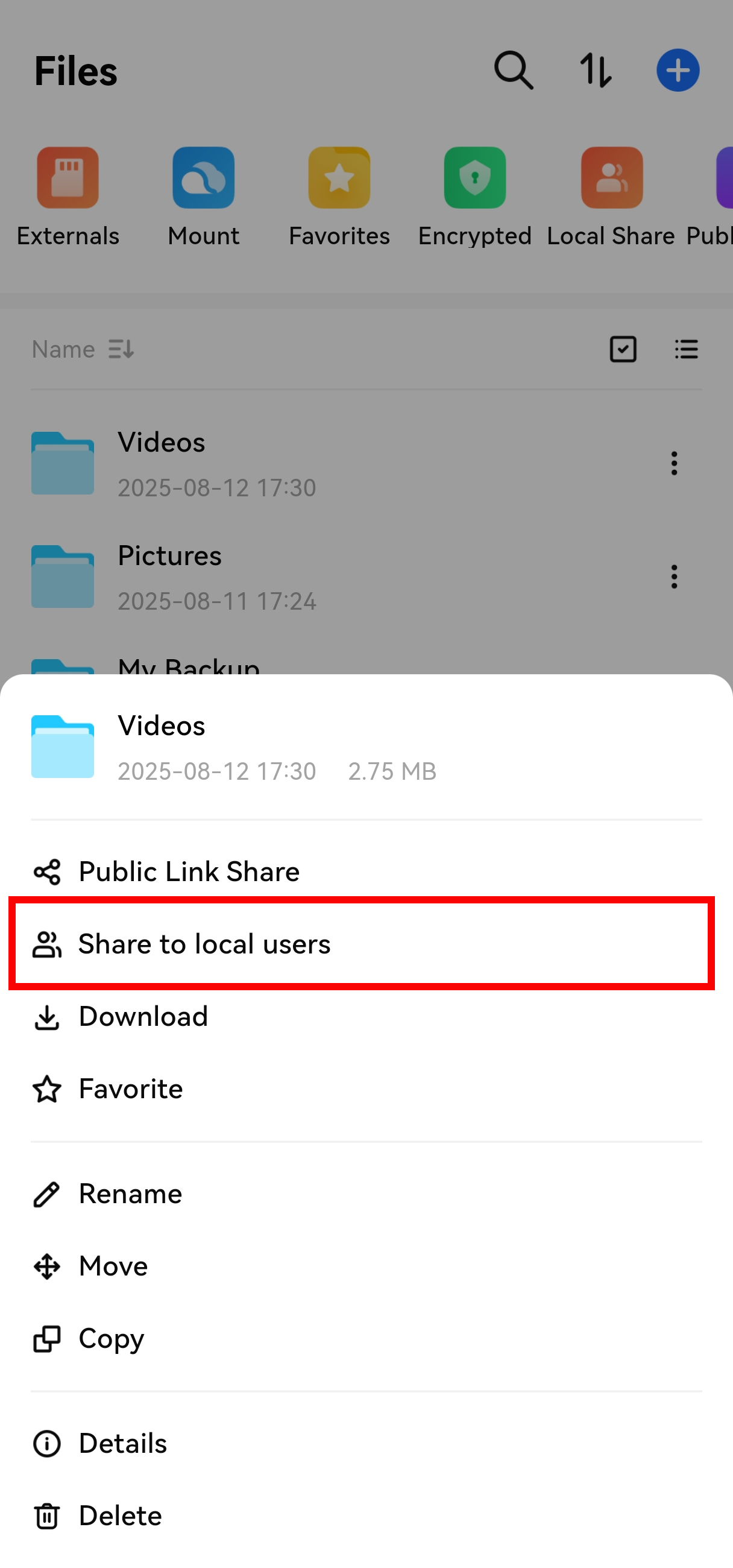 在 文件,找到需要分享的文件/文件夹,点击右侧更多菜单,创建本地共享。