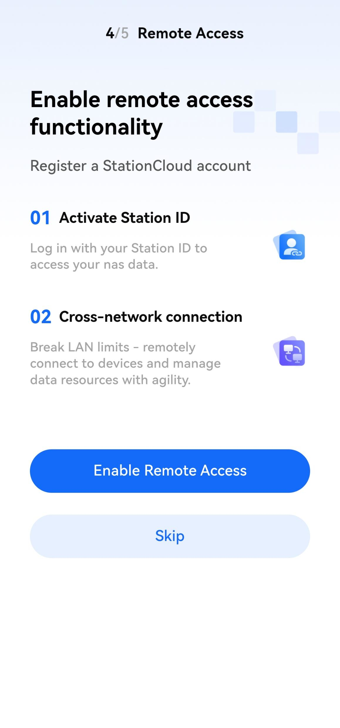 - 配置远程访问(可跳过,后续可在设备> 用户管理 中开启)。