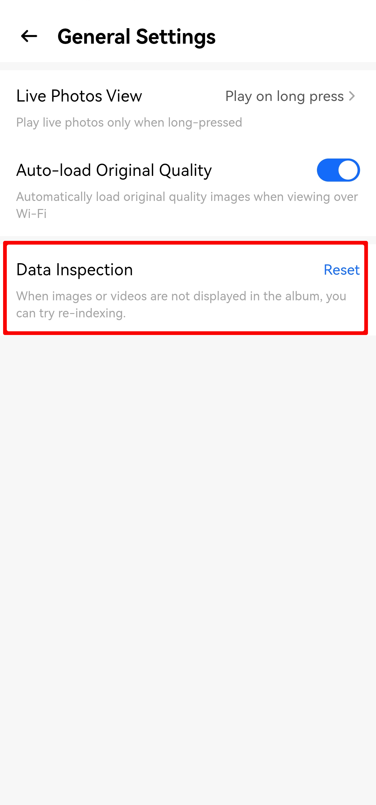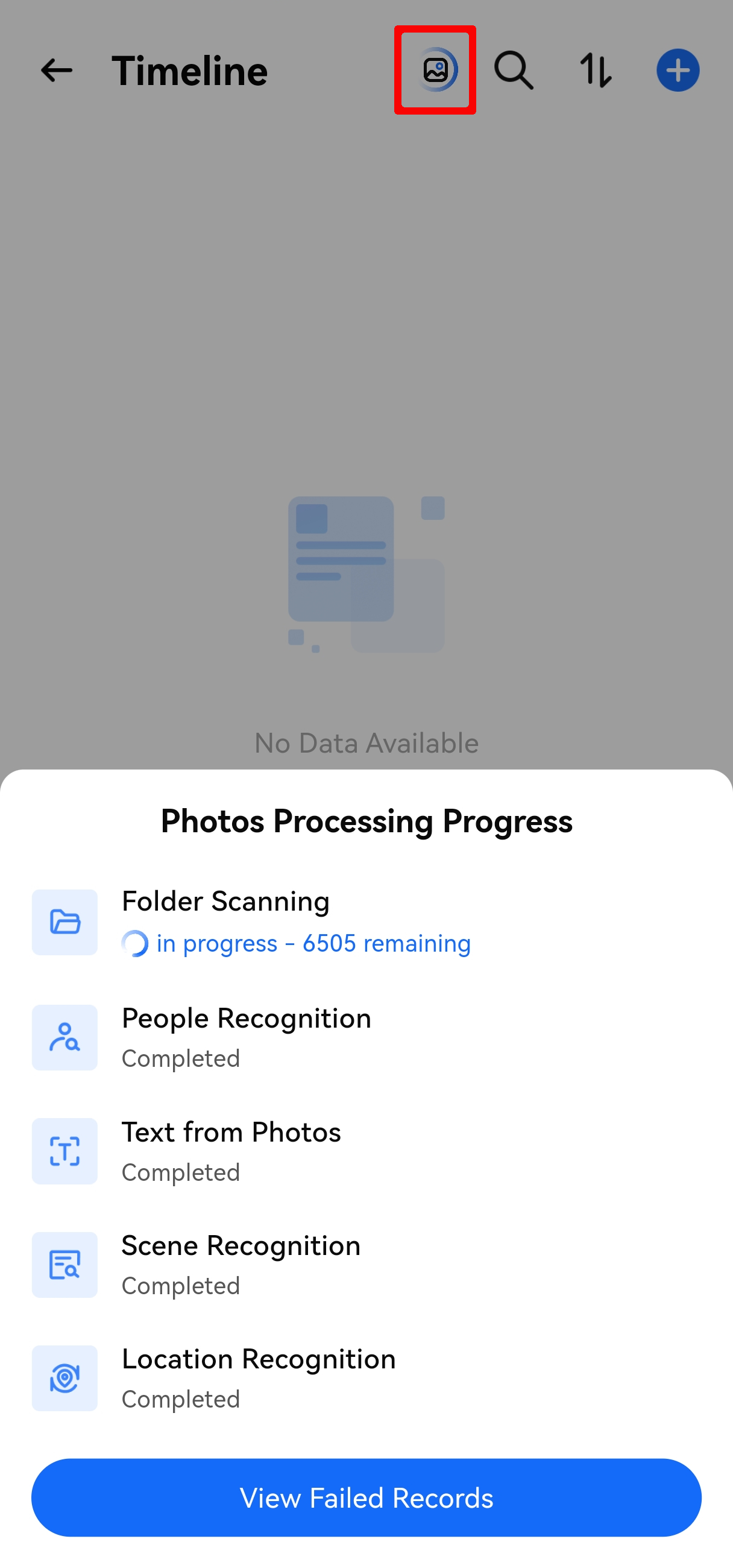 - 刷新耗时与照片资源规模相关:扫描过程将在后台持续进行,耗时与照片资源规模相关(照片越多,耗时越长)。若需查看进度,可通过 相册首页 > 顶部菜单 点击查看处理状态。